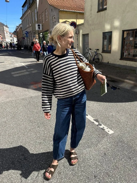 Beskrivelse Olga Sweater strikkes ovenfra og ned i Petiteknit Peer Gynt. Først strikkes øverste del av bakstykket frem og tilbake, hvor helling av skuldrene formes med forkortede pinner (vendepinner), samtidig som det strikkes striper. Deretter strikkes skuldrene hver for seg frem og tilbake på rundpinne. Disse samles foran for å danne forstykke. Forstykke og bakstykke samles deretter for å danne bolen, som strikkes rundt på rundpinne med striper. Ermene strikkes ut fra opplukkede m langs ermeåpningen. Halsens brettede halskant strikkes til slutt ut fra opplukkede masker. VEILEDENDE PINNER: PINNE NR 4 STRIKKEFASTHET: 20 MASKER = 10 CM |