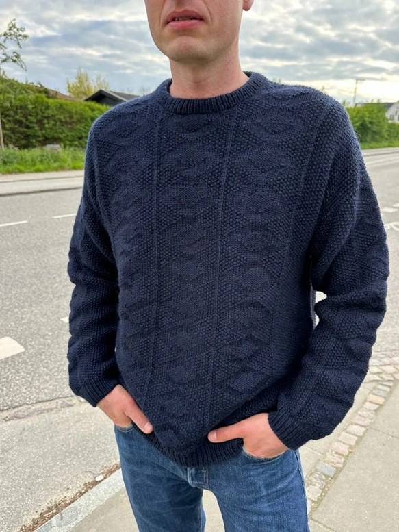 Beskrivelse Esther Sweater Man strikkes ovenfra og ned i strukturstrikk i Petiteknit Peer Gynt. Først strikkes øverste del av bakstykket med økninger. Deretter plukkes det opp masker til skuldrene som samles foran til forstykket. Forstykke og bakstykke samles under ermehullet og danner bolen som strikkes rett ned. Ermene strikkes rundt på rundpinne. Det strikkes vrangbordkant i halsen. VEILEDENDE PINNER: PINNE NR 4 STRIKKEFASTHET: 20 MASKER = 10 CM |