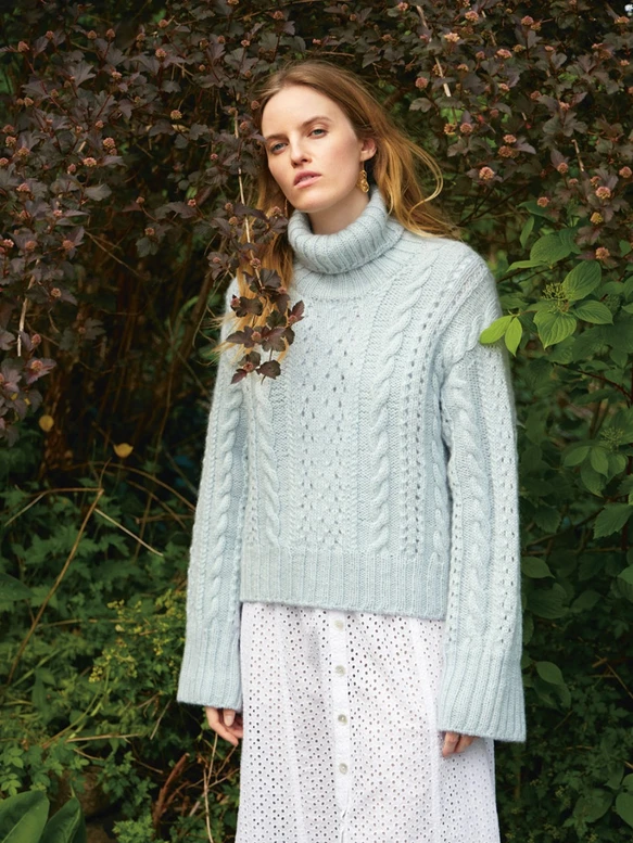 Beskrivelse Genseren strikkes ovenfra og ned med mønster etter diagram med Alpakka Ull og Tynn Silk Mohair. Først legges det opp masker til bakstykket som strikkes frem og tilbake med vendepinner for å forme skrå skuldre. Det strikkes så frem og tilbake til ned under ermene. Deretter strikkes det opp masker til forstykkene, hvor det felles og økes masker til halsutringning. Forstykkene strikkes sammen og strikkes frem og tilbake til ned under ermene. Deretter samles for- og bakstykket og strikkes rundt til hel lengde, før det avsluttes med en vrangbord. Det plukkes opp masker til ermer. Ermenes strikkes rundt med mønster etter diagram til hel lengde, før det avsluttes med en vrangbord på samme måte som på for- og bakstykket. Halskanten strikkes til slutt. Hele genseren strikkes med 1 tråd av hver kvalitet. STRIKKEFASTHET: 17 masker og 26 omganger diagram på pinne nr 4½ = 10 cm Veiledende pinner: Pinne nr 4½ |