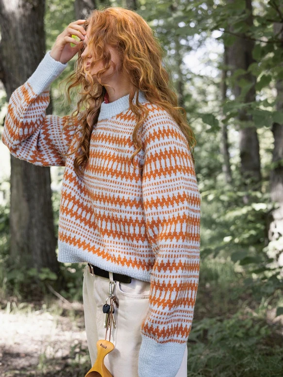 Beskrivelse Genseren strikkes ovenfra og ned i Mini Alpakka eller Tynn Peer Gynt. Det legges først opp masker til venstre forstykke, ermer, bakstykket og høyre forstykke, videre økes det til hals og raglan, samtidig som det strikkes diagram. Arbeidet tas sammen og bærestykket strikkes ferdig rundt etter diagram. Arbeidet deles til ermer, for- og bakstykket. For- og bakstykket strikkes rundt etter diagram før det avsluttes med en vrangbord. Ermene strikkes rundt etter diagram før det avsluttes med en vrangbord. Halskanten strikkes til slutt i vrangbord og brettes dobbel mot vrangsiden. Veiledende pinner: Pinne nr 3 Strikkefasthet: 27 masker = 10 cm |