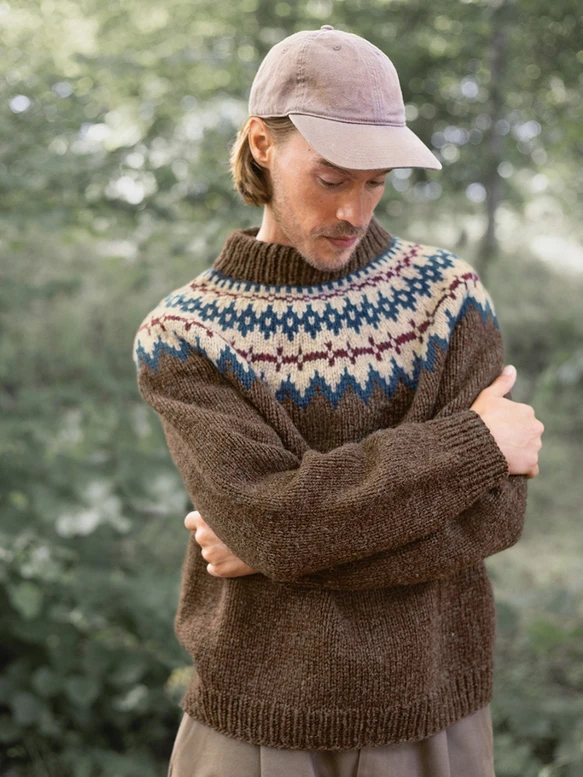 Beskrivelse Genseren strikkes i Fritidsgarn ovenfra og ned eller nedenfra og opp. Ovenfra og ned: Halskanten strikkes først. Det strikkes vendepinner for å forme en dypere halsutringning foran. Videre strikkes det mønster etter diagram med økning til rundt bærestykke. Arbeidet deles til ermer, for- og bakstykket som strikkes ferdig hver for seg. Nedenfra og opp: Vrangborden strikkes først, deretter strikkes det glattstrikk med bunnfargen til under ermene. Fra under ermene strikkes delene sammen. Det strikkes rundt med mønster etter diagram og felles til rundt bærestykke. Videre strikkes det vendepinner for å forme en dypere halsutringning foran. Halskanten strikkes til slutt. Veiledende pinner: Pinne nr 5½ Strikkefasthet: 15 masker = 10 cm |