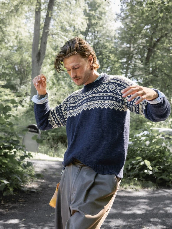 Beskrivelse Genseren strikkes i Peer Gynt ovenfra og ned eller nedenfra og opp Ovenfra og ned: Først strikkes bakstykket ned til under ermene. Videre strikkes det opp masker langs hver skulder til venstre og høyre side av forstykket. Det legges opp nye masker mot halsen før forstykkene strikkes sammen til ett forstykke. Forstykket strikkes ned til under ermene. Herfra strikkes for- og bakstykket sammen. For- og bakstykket strikkes rundt og avsluttes med en vrangbord. Det strikkes opp masker rundt hvert ermehull til ermer. Ermene strikkes rundt før det avsluttes med en vrangbord. Halskanten strikkes til slutt i vrangbord. Nedenfra og opp: Vrangborden strikkes først, deretter strikkes det glattstrikk med bunnfargen til under ermene. Herfra deles arbeidet og for- og bakstykket strikkes ferdig frem og tilbake hver for seg med mønster etter diagram. Ermene strikkes rundt nedenfra og opp med mønster etter diagram øverst. Halskanten strikkes til slutt. Veiledende pinner: Pinne nr 4 Strikkefasthet: 20 masker = 10 cm |