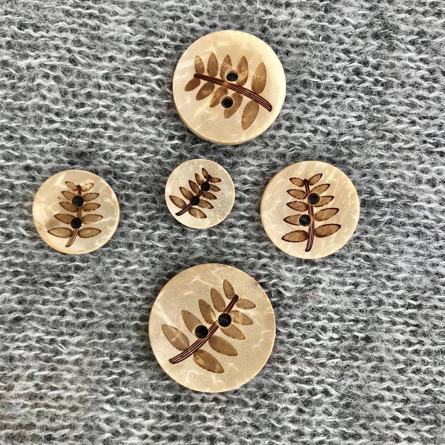 Beskrivelse Knapp av kokosnøttskall med motiv av rogneblad Størrelse: 12,5 -13 mm diameter Knappene er i rent naturmateriale og det vil være variasjoner i farger og trykk. Også små avvik i størrelser vil kunne forekomme. |