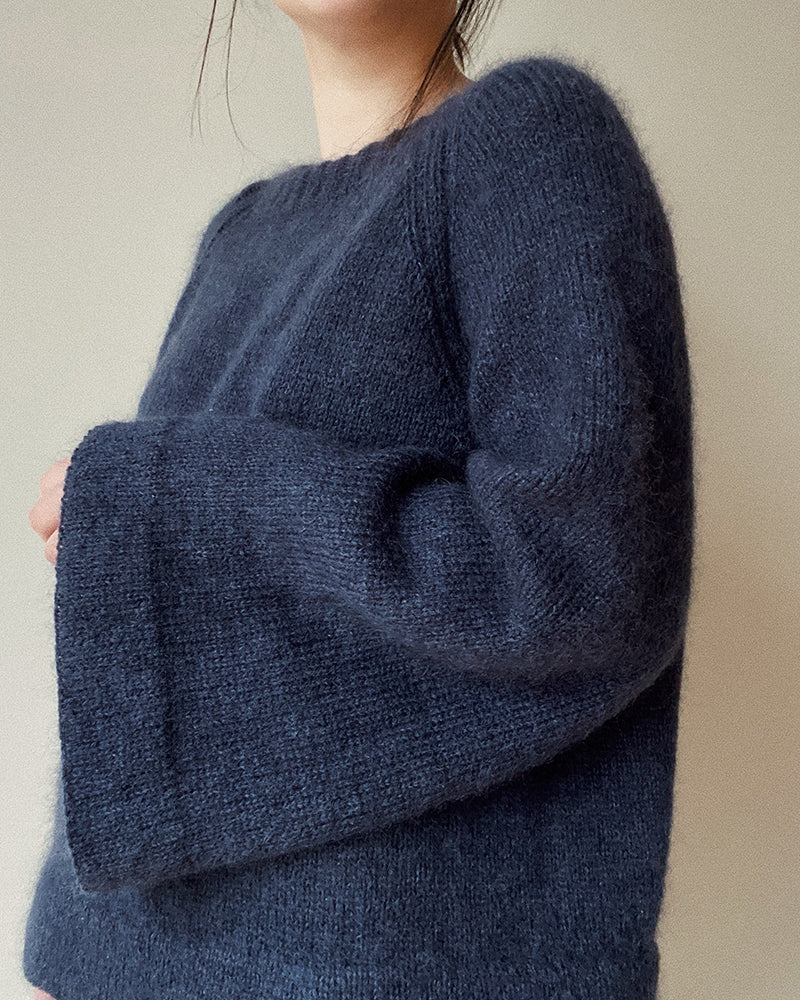 Beskrivelse Joo Sweater er en romslig genser inspirert av hanbok, Koreas nasjonaldrakt. Den som strikkes ovenfra og ned med raglanøkninger, og det strikkes vendepinner i nakken for å danne halsutskjæringen. Ermene strikkes i glattstrikk samtidig som det økes jevnt, noe som gir den vide passformen. Ermer og bol avsluttes med en brettekant og glattstrikk som brettes inn og sys eller strikkes fast til slutt. Størrelsene 1 (2) 3 (4) 5 (6) 7 (8) tilsvarer en overvidde på ca. 85 (90) 95 (100) 110 (120) 130 (140) cm, og målene oppgitt på forsiden av oppskriften er målene til det ferdige plagget. Joo Sweater skal ha en bevegelsesvidde («positive ease») på ca. 18-20 cm. Strikk en prøvelapp før du begynner, slik at du er sikker på at strikkefastheten blir riktig. Vanskelighetsgrad: 2 av 5 Størrelser 1 (2) 3 (4) 5 (6) 7 (8) Plaggets overvidde 103 (110) 115 (119) 130 (138) 148 (158) cm Plaggets lengde 56 (57) 58 (59) 60 (61) 62 (62) cm Veiledende pinner Rundpinne 3,5 (40 cm) Rundpinne 4 mm (40, 60 og 80 eller 100 cm) Strikkefasthet 21 m x 28 omg på pinne 4 = 10 x 10 cm Garnforslag 300 (350) 350 (400) 400 (450) 450 (500) g Isager Yarn Tvinni (50g = 255m) eller Sandnes Garn Sunday (50g = 235m) eller Rauma Lamull (50g = 235m) strikkes sammen med 200 (225) 225 (250) 250 (275) 275 (300) g Isager Yarn Silk Mohair (25g = 212m) eller Sandnes Garn Tynn Silk Mohair (25g = 212m) eller Filcolana Tilia (25g = 210m) Garnforslag uten mohair (én tråd) Hillesvåg Sol: 550 (600) 650 (700) 750 (800) 800 (900) g Oppskriften sende som papirutgave |