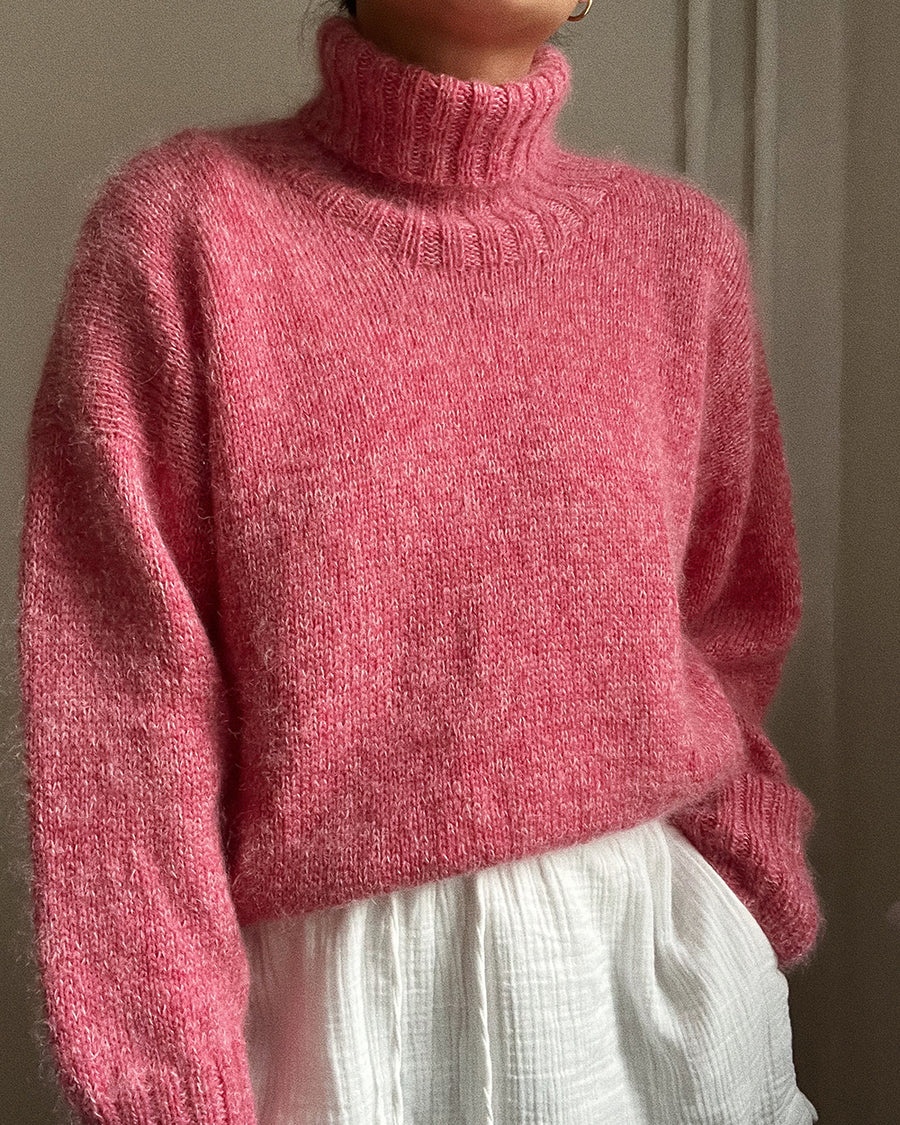 Beskrivelse Noma Sweater er en myk og romslig genser med en høyhalset og dobbel hals, som strikkes ovenfra og ned. Først strikkes bakstykket og forstykket hver for seg; øverste del av bakstykket strikkes før det tas opp masker i hver side for å danne skulder- og halsutskjæringen. Etter hvert samles maskene fra for- og bakstykket, og bolen strikkes rundt på samme pinne. Til slutt plukker man opp masker for å strikke ermer og hals. Alle deler avsluttes med en lang vrangbord i dobbel ribbestrikk. Strikk en prøvelapp før du begynner, slik at du er sikker på at strikkefastheten blir riktig. Genseren skal ha en bevegelsesvidde («positive ease») på ca. 15-20 cm. Vanskelighetsgrad: 2 av 5 Størrelser XS (S) M (L) XL (2XL) 3XL (4XL) Plaggets overvidde 100 (105) 110 (115) 120 (125) 130 (135) cm Plaggets lengde 53 (55) 58 (60) 62 (64) 64 (64) cm Plaggets ermelengde 48 (49) 50 (51) 52 (53) 53 (53) cm Veiledende pinner Rundpinne 3,5 mm (80 eller 100 cm) Rundpinne 4 mm (40, 60 og 80 eller 100 cm) Strømpepinner 3,5 mm Strikkefasthet 21 m x 28 omg i glattstrikk på p 4 mm = 10 x 10 cm Garnforslag 300 (300) 300 (350) 350 (400) 400 (400) g Filcolana Arwetta Classic (50g = 210m) eller Sandnes Garn Sunday (50g = 235m) eller KFO Merino (50g = 250m) eller Isager Alpaca 2 (50g = 250m) eller Rauma Lamullgarn (50g = 250m) eller Drops Flora (50g = 210m) strikkes sammen med 150 (150) 150 (175) 175 (175) 200 (200) g Sandnes Garn Tynn Silk Mohair (25g = 212m) eller Isager Silk Mohair (25g = 212m) eller Filcolana Tilia (25g = 210m) eller Drops Kid-Silk (25g = 200m) eller KFO Soft Silk Mohair (25g = 225m) eller Rauma Plum (25g = 250m) Genseren strikkes med dobbel tråd, og oppskriften angir totalt garnforbruk Oppskriften sende som papirutgave |