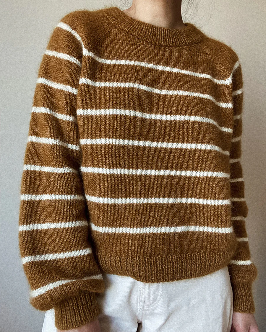 Beskrivelse Sunde Sweater er en stripete raglangenser som strikkes ovenfra og ned med raglanøkninger. Halsen brettes dobbelt, og det strikkes vendepinner i nakken for å danne halsutskjæringen. Bolen og ermene avsluttes med en bred vrangbord. Stripene gjentas hver 15.-17. p, og anbefalte videoer er listet nederst i oppskriften. Genseren skal ha en bevegelsesvidde («positive ease») på ca. 13-15 cm. Strikk en prøvelapp før du begynner, slik at du er sikker på at strikkefastheten blir riktig. Vanskelighetsgrad: 2 av 5 Størrelser XS (S) M (L) XL (2XL) 3XL Plaggets overvidde 99 (104) 109 (113) 123 (133) 144 cm Plaggets lengde 53 (55) 57 (58) 59 (61) 62 cm Veiledende pinner Rundpinne 3 mm (40 cm) Rundpinne 3,5 og 4 mm (40, og 80 eller 100 cm) Strømpepinner 3,5 mm Strikkefasthet 21 m x 28 omg på pinne 4 = 10 x 10 cm Garnforslag 250 (250) 300 (300) 350 (400) 450 g bunnfarge og 50 (50) 50 (50) 50 (100) 100 g kontrastfarge av Sandnes Garn Sunday (50g = 235m) eller Filcolana Arwetta Classic (50g = 210m) eller Drops Flora (50g = 210m) strikkes sammen med 125 (125) 150 (150) 175 (200) 225 g bunnfarge og 25 (25) 25 (25) 25 (50) 50 g kontrastfarge av Sandnes Garn Tynn Silk Mohair (25g = 212m) eller Filcolana Tilia (25g = 210m) eller Drops Kid-Silk (25g = 200m) For en kontrastfarge uten mohair kan det brukes 100 (100) 100 (100) 150 (150) 150 g enkel tråd Filcolana Pernilla (50g = 175m). Genseren strikkes med dobbel tråd, og oppskriften angir totalt garnforbruk. Oppskriften sendes som papirutgave |