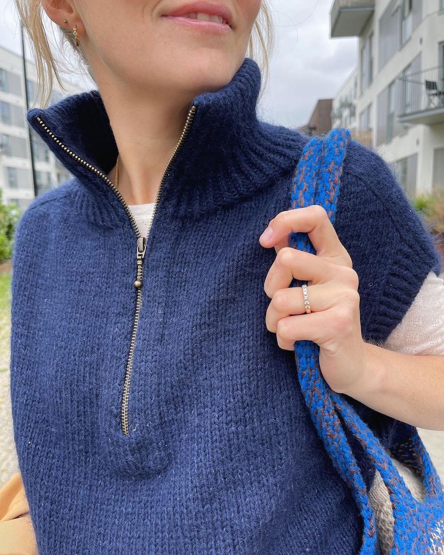 Beskrivelse Zipper Slipover strikkes ovenfra og ned. Halskanten strikkes i vrangbord som legges dobbelt og strikkes ned. Deretter strikkes skuldrene med økninger på både rett- og vrangside, og det strikkes vendepinner for å danne halsutskjæring. Forstykkenes masker settes til hvile mens bakstykkets strikkes. Deretter strikkes forstykkene, og til slutt samles forstykker og bakstykke for å danne bolen, som strikkes rett ned. Det strikkes en vrangbordkant i ermehullet ut fra opplukkede masker. Til slutt strikkes belegg til glidelåsen ut fra hvilende masker, slik at glidelåsen også fremstår pen fra vrangsiden. Glidelåsen monteres til slutt ved å sy den inn mellom de to strikkede lagene. Strikk en prøvelapp for å finne den pinnestørrelsen som gir deg rett strikkefasthet. Størrelsesguide Zipper Slipover bør ha en bevegelsesvidde (positive ease) på ca. 25 cm i forhold til ditt brystmål. Passformen er oversized. Størrelsene XS (S) M (L) XL (2XL) 3XL (4XL) 5XL svarer til et brystmål, målt på egen kropp, på 80-85 (85-90) 90-95 (95-100) 100-110 (110-120) 120-130 (130-140) 140-150 cm. Målene på den ferdige vesten er angitt på forsiden av oppskriften. Mål deg selv før du går i gang med å strikke, for å vurdere hvilken størrelse som vil passe deg best. Dersom du f. eks. måler 88 cm rundt om brystet (eller det bredeste sted på din overkropp), bør du strikke str. S. En vest i str. S har overvidden 113 cm og vil i nevnte eksempel gi en bevegelsesvidde (positive ease) på 25 cm. Størrelser: XS (S) M (L) XL (2XL) 3XL (4XL) 5XL Vestens overvidde: 108 (113) 119 (121) 132 (141) 152 (161) 172 cm Lengde: 61 (63) 65 (66) 66 (67) 67 (68) 68 cm (målt midt bak, eksklusiv halskant) Strikkefasthet: 15 masker x 24 omganger i glattstrikk på pinne 5 mm = 10 x 10 cm etter vask og blokking 16 masker x 24 omganger i vrangbord (1 vridd r, 1 vr) på pinne 5 mm = 10 x 10 cm etter vask og blokking (strikkefasthet for vrangbordkant nederst på bolen) 21-22 masker x 24 omganger i vrangbord (1 vridd r, 1 vr) på pinne 4 mm = 10 x 10 cm etter vask og blokking (strikkefasthet på halsens vrangbordkant) Veiledende pinner: Rundpinne 5 mm (80 og evt. 100 cm), rundpinne 4 mm (40 og 80 cm), strømpepinner eller rundpinner 4,5 mm Materialer: 400 (400) 450 (450) 500 (500) 550 (550) 600 g Peruvian Highland Wool fra Filcolana (50 g = 100 m) eller 400 (400) 450 (450) 500 (500) 550 (550) 600 g Alpakka Ull fra Sandnes Garn (50 g = 100 m) strikkes sammen med 100 (100) 100 (100) 125 (125) 125 (150) 150 g Tilia fra Filcolana (25 g = 210 m) eller Tynn Silk Mohair fra Sandnes Garn (25 g = 212 m). Glidelås 6 mm, 35 cm |