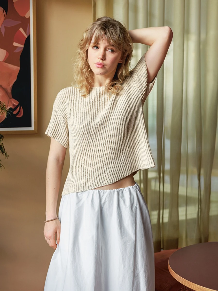 Beskrivelse T-skjorten strikkes ovenfra og ned i ribb i Line. Det legges først opp masker til bakstykket. Bakstykket strikkes frem og tilbake med vendepinner for å forme skrå skulder, før det strikkes ned til under ermene. Videre strikkes det opp masker på hver skulder til venstre og høyre side av forstykket. Det legges opp nye masker mellom forstykkene før hele forstykket strikkes frem og tilbake til under ermene. Forstykket samles så med bakstykket, og t-skjorten strikkes videre rundt til hel lengde. Det strikkes opp masker rundt ermehullet til ermer. Ermene strikkes med vendepinner, før de strikkes rundt i ribb til hel lengde. Til slutt strikkes det en i-cord kant rundt halskanten. VEILEDENDE PINNER: PINNE NR 4 STRIKKEFASTHET: 20 MASKER = 10 CM |