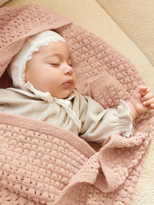 Teppet strikkes frem og tilbake med rillekanter, de øvrige maskene strikkes med mønster etter diagram. Strikket i Babyull Lanett