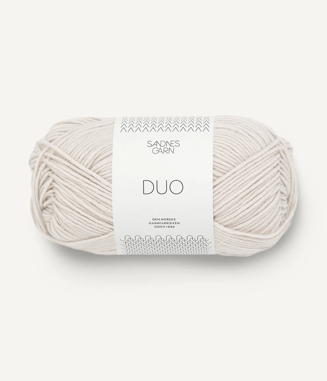 Beskrivelse Duo er et veldig behagelig helårsgarn. Et godt alternativ til dem som synes at ull klør. Ullen gjør at garnet blir lettere, mer elastisk og isolerer bedre enn ren bomull. Bomull klør ikke. Blandingen av merinoull og bomull gjør denne kvaliteten til et lett og mykt garn som isolerer godt. Et godt alternativ til dem som synes at ren ull klør. Vår leverandør har garantert at ullen vi kjøper ikke kommer fra sauer som har blitt utsatt for mulesing. Vasker du i maskin anbefaler vi at alle ullplagg vaskes separat på ullprogram for en mest skånsom behandling. På grunn av merinoullens unike absorberingsevne er det viktig å sentrifugere håndstrikkede plagg godt, før det tørkes flatt, gjerne oppå et håndkle. Bruk aldri vaskepose når du vasker håndstrikkede plagg i ull. Dette skaper friksjon som kan føre til at plagget tover. LØPELENGDE: CA. 115 METER PR. 50 GRAM VEILEDENDE PINNER: PINNE NR 3½ STRIKKEFASTHET: 22 MASKER = 10 CM RÅVARE KOMMER FRA: BOMULL FRA INDIA, MERINOULL FRA AUSTRALIA OG SØR-AMERIKA |